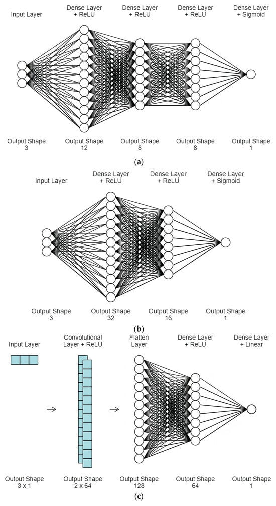 M4SAB, M3SAB, and M3SRM all utilized multilayer perceptrons, which are a type of deep learning network. In multilayer perceptrons, all layers are referred to as dense or fully connected layers. C4LRM, on the other hand, combined a multilayer perceptron with a convolutional network, which is another type of deep learning network commonly used for image data analysis and feature extraction. The merging of these networks is achieved through a layer called Flatten, which reduces the layer size to a vector size. M4SAB and C4LRM both employed four-layered neural network models, while M3SAB and M3SRM used three-layered neural network models.