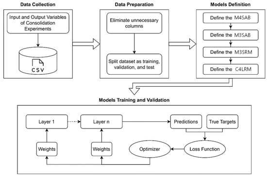 Figure 6 illustrates the proposed workflow, providing a visual representation of the research methodology. In the data collection process, the input and output variables needed for consolidation prediction are combined into a single file. For the data preparation phase, our dataset, which is represented as a single file, was divided into distinct sections for training, validation, and testing purposes in the models. During the model definition phase, all models were implemented in the software using their specific neural network architectures and parameters. The training and validation processes of the models encompass essential operations such as training and validating the neural networks within the software, illustrated as flow diagrams in the figure below.