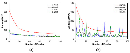 The training and validation results of the models, assessed using the MAPE metric, are presented in Figure 7a,b.