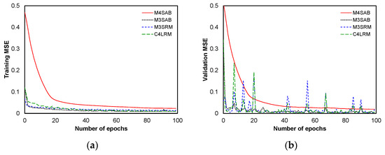 The training results of the models, evaluated through the MSE metric, are depicted in Figure 8a. Models with lower MSE values indicate higher efficacy compared to their counterparts. Consequently, the M4SAB model stands out as the least effective, given its significantly higher MSE value in comparison to the other models. Further analysis reveals M3SRM’s superior performance relative to the M4SAB model, although with a slight gap from the M3SAB and C4LRM models. The M3SAB and C4LRM models exhibit closely aligned results, establishing them as the most proficient models in this context. Furthermore, the validation results of the models, assessed based on the mean squared error (MSE) metric, are displayed in Figure 8b. Lower MSE values in models signify superior performance within the group. Thus, the M4SAB model emerges as the least effective, characterized by a notably higher MSE value compared to its counterparts. The graphical representation demonstrates that the M3SAB, M3SRM, and C4LRM models produce closely aligned outcomes with minor differences, occasionally accompanied by sporadic upward deviations.