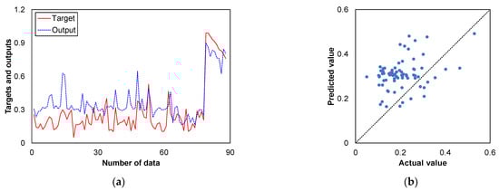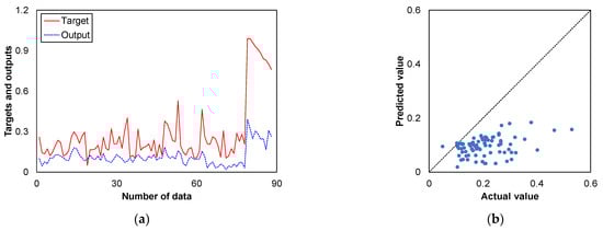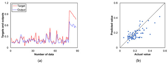 The test results of output prediction value and comparisons between 88 samples of the test dataset (actual values) and predicted values from developed models are presented in Figure 10, Figure 11, Figure 12 and Figure 13, respectively. The prediction results of the models were the values calculated by the neural networks performing the regression operation. The performance of the developed models was assessed using evaluation metrics. The results obtained from the evaluation of the regression models indicate the performance and effectiveness of each model in predicting the consolidation data.