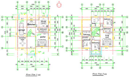 This project was located in Nanjing, the capital of Jiangsu Province. The climate is hot in summer and cold in winter, with an average annual temperature of 13–22 °C and an annual rainfall of 1090.6 mm. It has a humid subtropical monsoon climate with four distinct seasons, with rain and heat in the same season. The dominant wind direction in winter are northeast wind and east wind. The project building was a single-family villa, covering an area of 100 square meters, with a total construction area of 281 square meters, a building height of 11.2 m, no basement, an indoor and outdoor height difference of 0.45 m, and a design service life of 50 years (according to the Unified Standard for Reliability Design of Building Structures GB50068-2018) [25]. The roof waterproofing level was four, and the building fire resistance level was two. According to the Design Standard for Energy Efficiency of Residential Buildings in Hot Summer and Cold Winter Zone (JGJ 134-2010) [26] requirements for the window area in each direction, the window area of the building was designed as 0.30 to the east and west and 0.26 to the south and north. The floor plan of this villa is shown in Figure 2.