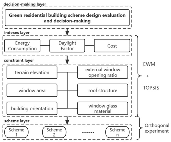 In this study, the comprehensive performance standards of green buildings were considered in a test, and the use of orthogonal experiments was proposed to optimize the design scheme, which improved the test efficiency. Furthermore, an evaluation analysis model combining the EWM [16] (entropy weight method) and the TOPSIS [17] (technique for order preference by similarity to an ideal solution) method was constructed. TOPSIS is a relatively objective method and EWM is applied to reduce TOPSIS’s dependence on weights. Based on orthogonal experiments, the connection EWM and TOPSIS is beneficial for improving the scheme optimization of green building designs.