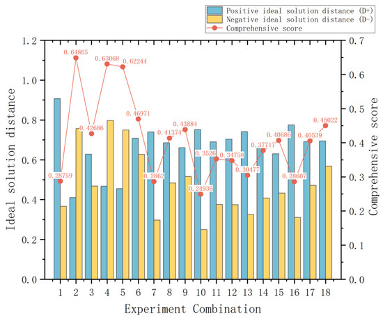 - Calculate the distance between each index value and the positive and negative ideal scheme values. Comparing the scheme designed using orthogonal experiments with the best optimization scheme and the worst optimization scheme can be calculated using the following formula:where is the distance from the target to the optimal target, and is the distance from the target to the worst target.