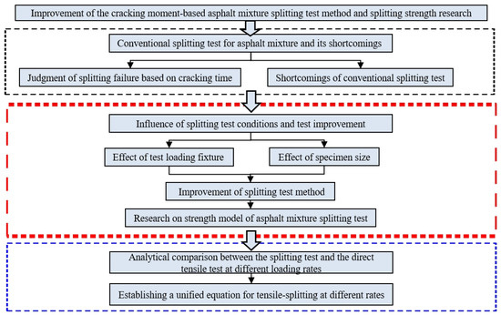 This study addresses the question of splitting test accuracy by utilizing digital image processing technology, employing the moment of cracking as a judgement indicator and conducting an improvement study on the splitting test with respect to the specimen size and test loading method, among other aspects. The impact of the improvement is confirmed by comparing the results with the strength theories that are currently in use. Lastly, a suggested splitting test program is provided, which may effectively lower the test error and data dispersion, allow the more precise assessment of asphalt materials’ tensile strength, and serve as a useful guide for the testing of other materials’ tensile strength. The specific research plan is shown in Figure 1.