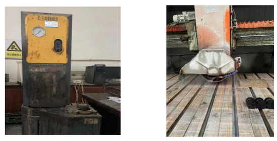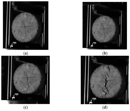 The strength of the split test is significantly impacted by the test fixture as well. Previous array parallel tests on 12.7 mm arc bars have all revealed that the terminal stress concentration eventually cracks. P. Jonsén [17] conducted a rock splitting test by varying the arc of the arc splint. The outcomes demonstrated that altering the clamp’s size could successfully reduce the stress concentration at the end. Therefore, 15 sets of parallel tests were conducted for each of the 19 mm arc bar splitting and rigid pressing plate splitting specimens in this section at the loading rate of 60 mm/min, chosen via earlier testing, maintaining the test specimen thickness of 35 mm and the test temperature of 15 °C. Figure 9, Figure 10, Figure 11 and Figure 12 illustrate the cracking moments and typical damage diagrams of the 19 mm curved compression bar splitting and rigid compression plate splitting specimens.