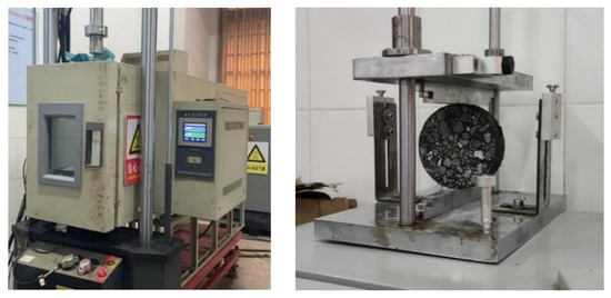 A common technique for the estimation of the strength and low-temperature cracking resistance of asphalt pavements is the asphalt mix splitting test, often referred to as the indirect tensile test [5,6]. In the same year, Carneiro [7] and Akazawa [8] independently proposed the Brazilian disc test, which led to the development of the splitting test. The theoretical basis of the splitting test method is that, when a cylindrical specimen is subjected to radial compression, a relatively uniform transversal tensile zone appears at its center. A. Fahimifar [9] studied the impact of the boundary conditions and aspect ratios on the tensile splitting strength. By constructing finite element models under various boundary conditions and simulating fatigue tests and direct tensile tests, it was found that the strength of the splitting test was also affected by the location of the load application. Ma Yszko et al. [10] conducted splitting tests on cubic specimens at different load positions. According to the test results, the load applied along the height of the cube produced better results than that applied along the diagonal. When the location of the load application was changed, there was no significant difference in the splitting test results. Some researchers use soft wood spacers (cushions) between the specimen and the loading plate to reduce the impact of stress concentration at the loading end [11]. The 18th Road Conference Proceedings and the Japan Road Association suggest that, in practical engineering applications of the splitting test, rigid pressure plates should be immediately used for the splitting test, which is also the simplest loading technique [12]. Some scholars have found that, when a uniformly distributed load is applied to the specimen and the loading angle between the loading end and the specimen is controlled at around 20°, the specimen will start cracking from the middle [13,14]. Based on these conclusions, some researchers have developed an arc-shaped loading clamp with the same curvature as the specimen for the splitting test [15], and they have conducted a large number of laboratory tests, confirming that, when this loading method is used, some specimens’ cracks start from the center point. However, when the arc-shaped loading clamp does not establish full contact with the circumference of the specimen, stress concentration at the loading end still exists. Therefore, with this improved technique, it is necessary to ensure the processing accuracy of the clamp and the specimen, as well as the alignment of the upper and lower loading clamps. The cost of this test is high, and it has not been widely promoted and accepted. Sarfarazi et al. [16] developed a new instrument that can directly apply tensile stress to the test piece. The disadvantage is that the overall structure of the equipment is complex and the stress at the failure point of the test piece is uneven, making it difficult to obtain accurate strength measurement results. Some researchers have found that the splitting test cannot satisfy the center point cracking hypothesis in theoretical derivation due to stress concentration at the actual loading end, and the strength value obtained from the splitting test stress concentration under cracking does not reflect the real tensile strength [17].