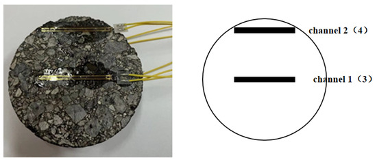 We pasted strain gauges along the horizontal direction at the center of the circle (channel 1), where the specimen was theoretically subjected to tensile force and the first to crack, and at the end of the specimen, which was prone to stress concentration cracking (channel 2), in order to more intuitively analyze the cracking state of the split specimen. We also pasted strain gauges at the same positions on the other side of the specimen (channel 3 and channel 4). The top portion of the strain gauges for channels 2 and 4 was approximately 9 mm away from the apex of the vertical axis, and the strain gauges were pasted on the horizontal axis at the round center points of the two end faces, as shown in Figure 4. In order to facilitate the strain collection procedure and determine the crack initiation point’s position and timing, as well as the crack penetration sequence, the test additionally employed video equipment to film the whole specimen splitting test process.