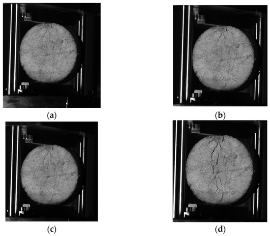 Splitting test of test piece 2. (a) Initial stage end stress concentration cracking. (b) Cracking at the center of the circle. (c) Crack propagation stage. (d) Formation of through cracks.