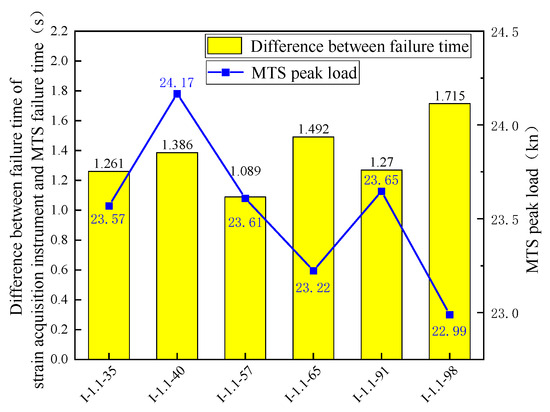 This study then calculated the difference between the strain gauge failure time and the MTS peak load time and the MTS peak load for 6 groups’ central cracks first specimens, as well as their corresponding MTS peak loads, which were plotted as shown in Figure 7.
