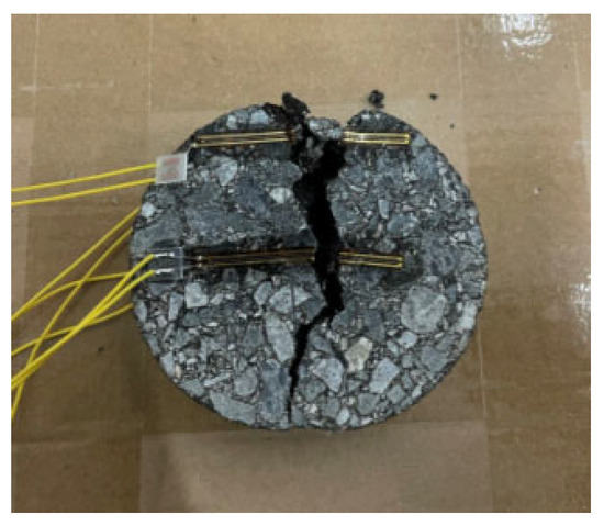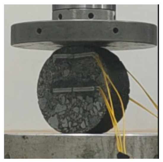 For the asphalt mixture splitting test, this study utilized a MTS (Material Testing System)—the Landmark Multi-Purpose Material Testing System. The upper and lower compression strips were connected to the loading end to load the specimens. The MTS system measured stress and strain in the vertical direction, while a JM3812 wireless static strain gauge measured the strain on the specimen surface. According to the specifications, the test was loaded utilizing controlled displacement at a rate of 60 mm/min, and the test loading fixture was 12.7 mm arc-shaped batten. The specimen was loaded as shown in Figure 3.