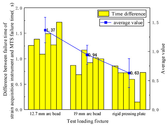In line with the valid data points determined in Section 2.2, Figure 13 presents the differences between the MTS peak load and the strain acquisition instrument failure time for the valid data points in both loading modes.