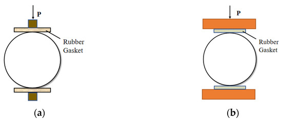 Principle of rubber gasket splitting test. (a) Initial loading stage of the 12.7 mm arc-shaped batten. (b) Initial loading stage of the rigid pressing plate.