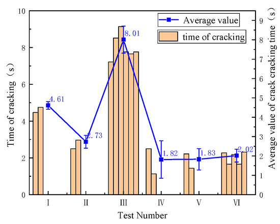 As can be seen in Figure 15 and Figure 16, this study analyzed the test data and obtained results for the splitting strength, cracking duration, and cracking moment difference of valid specimens under six distinct loading scenarios, in accordance with the judgement method of specimen failure presented in Section 2.3.