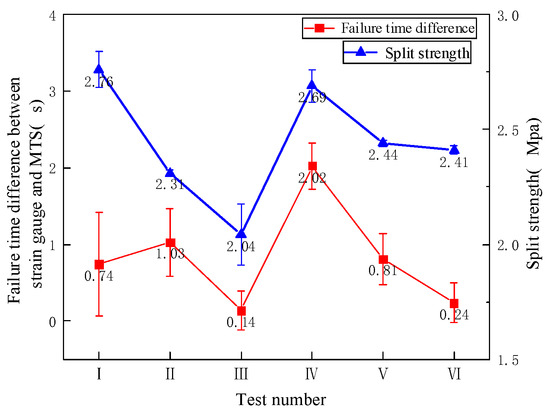 The statistical difference between the MTS failure time and the strain gauge failure time at the effective data point is depicted in Figure 16. Although the average time obtained by splitting the 12.7 mm arc bead is shortened to 0.140 s, which significantly lessens the impact of stress concentration, the starting time of the strain gauge is still later than the peak time of the MTS load. This finding suggests that the introduction of rubber gaskets can indeed resolve the issue at the loading end. The starting point of the splitting test can be transferred from the edge of the loading strip to the center area after the thickness of the rubber gasket is reduced, which is consistent with one of the theoretical assumptions of the splitting test. In comparison to the other loading circumstances, the splitting strength values demonstrated a considerable decrease under the loading of a 10 mm rubber gasket + 12.7 mm arc-shaped batten. This shows that, while the rubber mat helps the material to break first in the center of the circle, it also absorbs some of the energy, lowering the splitting strength. As a result, it is important to regulate the rubber mat’s thickness as much as possible within a range that does not impact its splitting strength.