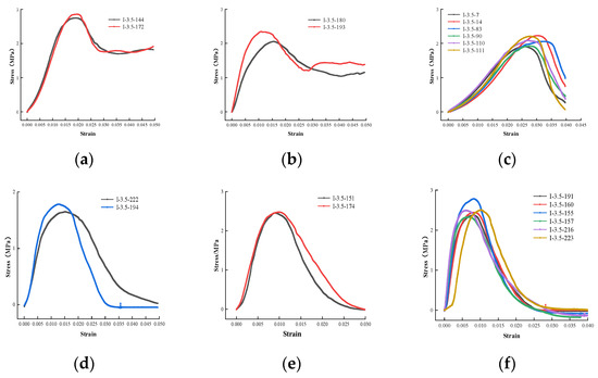 This study processed the test findings using the principle of valid data screening, which is explained in Section 2.3, to create a stress–strain curve for each valid specimen, as shown in Figure 17, in order to better assess the stress patterns of the specimens.