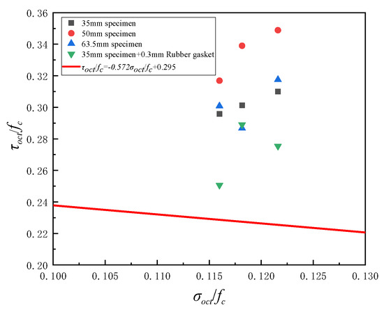 Four representative splitting test data of 63.5 mm, 50 mm, 35 mm, and 35 mm + 0.3 mm rubber mats under the loading of 12.7 mm curved compression strips were selected and substituted into Formulas (3) and (4) in order to verify the improvement effect of the splitting test in this study. was obtained in accordance with the requirements of the uniaxial compression test of asphalt mixtures, and the average was 11.4 Mpa. After processing the data points, this study considered them alongside Huang’s suggested damage criterion [21] for the AC-13C asphalt mixture on the hydrostatic pressure surface. Figure 19 presents the findings.