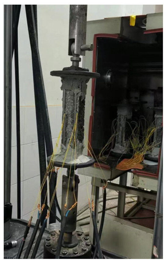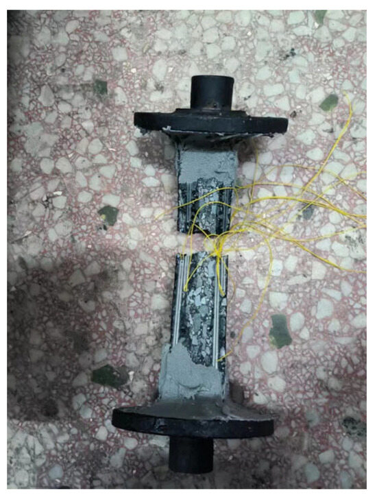 Using the same conditions as in the previous experiment, rectangular specimens of the AC-13C asphalt mixture were cut, measuring 50 mm × 50 mm × 250 mm. Strain gauges were attached to the specimens’ four outside surfaces in order to record the specimens’ breakage moments, and the ends of the specimens were attached to the MTS loading plate using epoxy glue. In order to more accurately analyze the effect of different loading rates on the damage of the specimen, tension force was applied in the form of stress control, and the MTS tension rates were 2 kn/s, 4 kn/s, 6 kn/s, and 8 kn/s, respectively. The splitting test used the recommended loading method described earlier, also in the form of a stress control, with loading rates of 2 kn/s, 4 kn/s, 6 kn/s, and 8 kn/s. The test temperature was 15 °C, as indicated in the specifications. The loading process of the direct tensile test is illustrated in Figure 20, and the specimen after tensile failure is shown in Figure 21.