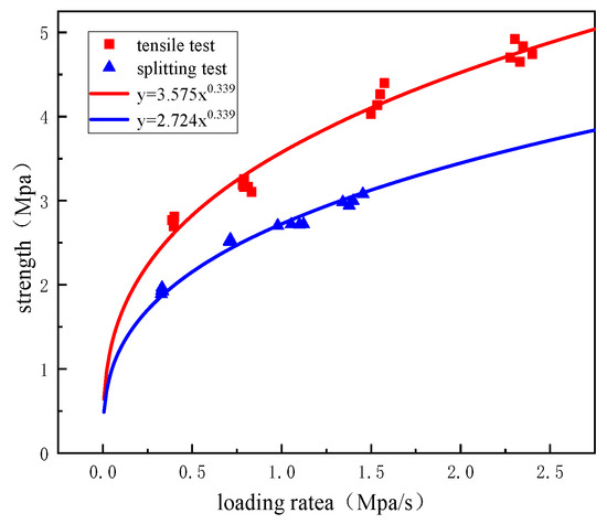 The results of Formulas (8) and (9), as well as all the splitting and tensile tests, are plotted in the strength–rate relationship diagram shown in Figure 22.