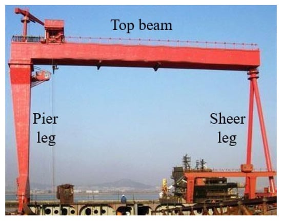 The gantry crane system in Figure 2 is assumed to be an in-plane two-dimensional system and consists of three beams connected to each other. The beam on the left is considered to be a sheer leg with a height of H, the horizontal beam is a top beam with a length of L, and the right beam is a pier leg with a height of h. Table 1 lists the geometrical and dynamic characteristics of the test gantry crane.