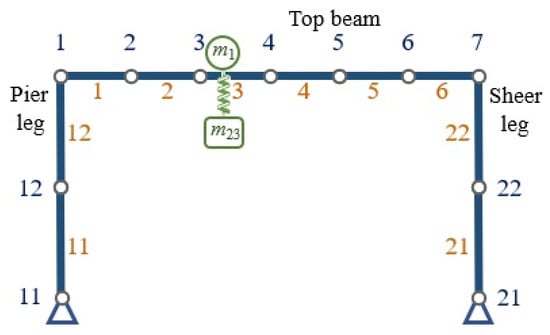 Figure 2 shows the structure’s characteristics when each of the three beams is meshed and coupled together. The structure is divided into ten elements, of which the pier leg has two, the sheer leg has two, and the top beam has six. Therefore, the structure consists of 11 nodes in total. The load on the horizontal beam is the moving mass on the crane that has a suspended payload, and it is considered to be a mass and spring system that has one degree of freedom in mashing (Figure 2).