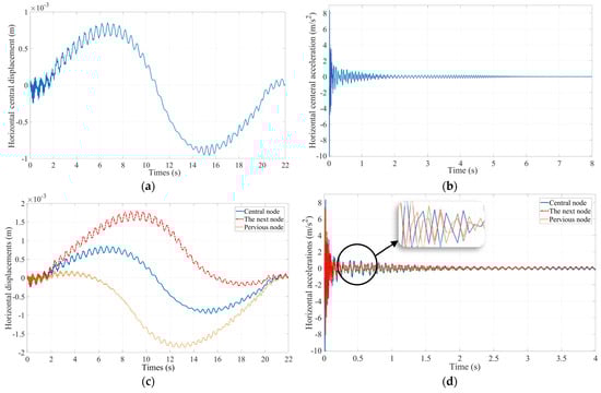 The horizontal displacement and acceleration of the top beam: (a) displacement of central node; (b) acceleration of central node; (c) displacement of before central, central, and after central nodes; and (d) acceleration of before central, central, and after central nodes.