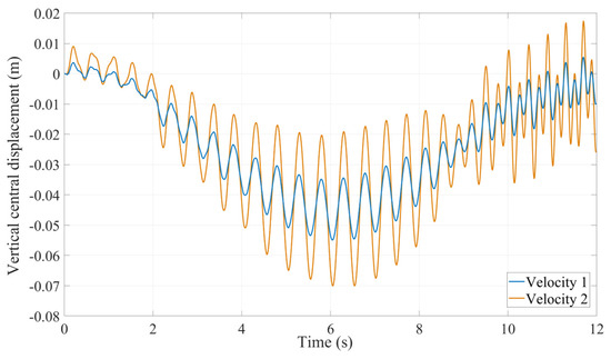In Figure 11, the central point displacement of the top beam is illustrated under two different moving mass velocities. As expected, if the moving mass passes over the crane with the second velocity pattern, the displacement and vibration amplitude will increase.