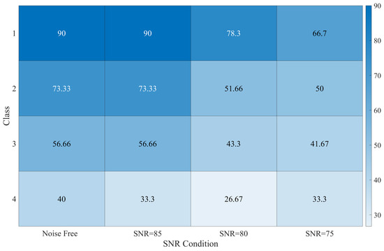 After applying the neural network to the system and training it, the network was tested, and the results are reported. It should be mentioned that, in the extracted characteristics, out of 100 simulated iterations for each subclass, 80 iterations were used for training, and 20 iterations were used to test the network. The stiffness matrix values are randomly altered in each iteration to create 100 simulated iterations in each subclass to acquire the mentioned properties. Noises were also added to the test inputs, with white Gaussian noise and different signal-to-noise ratios (using the awgn function in MATLAB R2022b), in order to further ensure the validity of the network.
