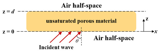Figure 1 depicts an unsaturated porous elastic plate of thickness d exposed to air, with z = 0 denoting its lowest surface. Acoustic waves are incident on the lower surface with an incidence angle of . In order to provide a simple and convenient explanation of the application of the modified transfer matrix method in the propagation of elastic waves in unsaturated porous materials and to compare it with the bonding situation between porous materials and rigid panels, we use the situation in Figure 1 to derive and explain the modified transfer matrix method, laying a foundation for its bonding with the elastic layer. To calculate the sound absorption properties of a structure that involves an unsaturated porous elastic plate, we use the sound pressure p and sound velocity in the air as state vectors. These state vectors on both sides of the plate are connected through a total transfer matrix , expressed in Equation (12), which we need to determine to calculate the sound absorption properties of the structure.