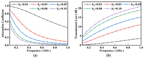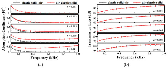 Figure 13, Figure 14, Figure 15 and Figure 16 present a comparison of the sound absorption performance when the solid elastic plate is bonded above and below the porous elastic plate, respectively. The black curve corresponds to the case when the solid elastic plate is bonded below the porous plate, whereas the red curve represents the scenario where the solid plate is bonded on top. As depicted in Figure 13a, the position of the solid elastic plate has a significant impact on the absorption coefficient, especially when the thickness of the porous elastic plate is larger. In general, as the thickness of the porous plate increases, the absorption coefficient in both cases decreases; however, when the solid plate is bonded below the porous plate, the absorption coefficient decreases at a faster rate than when the solid plate is on top. Therefore, as the thickness of the porous plate increases, the difference in the absorption coefficient between the two cases becomes increasingly apparent. Specifically, when a solid plate is on top of a porous plate, the absorption coefficient of the structure is higher than when the solid plate is below the porous plate, and this difference grows as the thickness of the porous plate increases. As for Figure 13b, the transmission loss increases as the thickness of the porous plate increases, and the difference in both cases also becomes more significant with the increase in thickness. Additionally, when only one side of the structure is bonded with a solid plate, the sound absorption characteristics of the structure are not significantly different from when both sides are bonded with a solid plate.