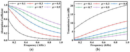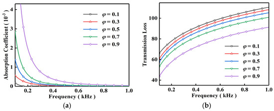 Figure 6 shows the sound absorption characteristics of unsaturated porous elastic plates exposed to air with different porosities. As shown in Figure 6a, the absorption coefficient increases with increasing porosity. When the porosity is greater than 0.5 and the frequency is 0.1 kHz, the absorption coefficient approaches 1. However, when the porosity is reduced to 0.1, the absorption coefficient is approximately 0.6. As demonstrated in Figure 6b, when the porosity is held constant, the transmission loss increases with frequency, with the most significant change observed when the porosity is small. As porosity increases, the transmission loss decreases, ranging from 5 to 20 dB for a porosity of 0.1 and 0 to 13 dB for other selected porosity settings.