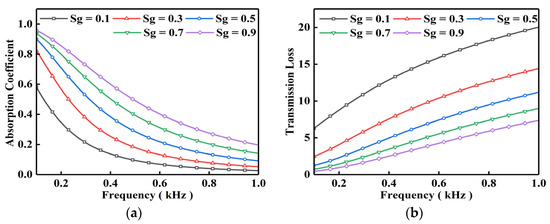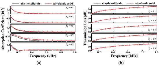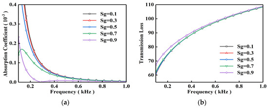 Figure 7a,b show the absorption coefficients and transmission losses of unsaturated porous elastic plates with different gas saturations, respectively. Similar to the previous parameters, the dependence of the absorption coefficient and transmission loss on frequency and saturation is opposite. Specifically, the absorption coefficient increases with increasing saturation, and the transmission loss decreases.