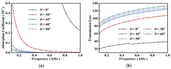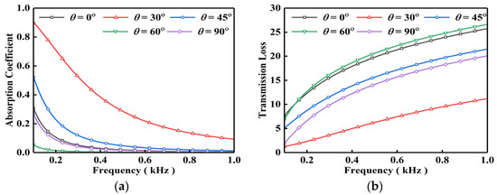 Figure 12 displays the sound absorption properties for various sound wave incident angles. Among the chosen incidence angles, it can be observed that the absorption coefficient decreases as the incidence angle increases when the incident angle is less than 60 degrees. And the transmission loss increases as the incident angle increases.