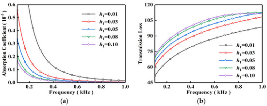 Figure 5 illustrates the sound absorption characteristics of the unsaturated porous elastic plate with varying thicknesses exposed to air. As shown in Figure 5a, the absorption coefficient decreases with increasing frequency, and the rate of decrease is slower for thinner plates. As the thickness of the elastic plate increases, the absorption coefficient gradually decreases, and the rate of decrease with frequency becomes greater. In contrast to the trend observed for the absorption coefficient, Figure 5b shows that the transmission loss of the unsaturated porous elastic plate increases with frequency and plate thickness. For plate thicknesses ranging from 0.01 to 0.1 m, the transmission loss of the unsaturated porous elastic plate exposed to air is between 0 and 20 dB. Compared with fluid-saturated porous materials of the same thickness, unsaturated porous materials have added gas to their pores, allowing them to flow with the air on both sides of the porous material plate, reducing the absorption coefficient and transmission loss of the structure.