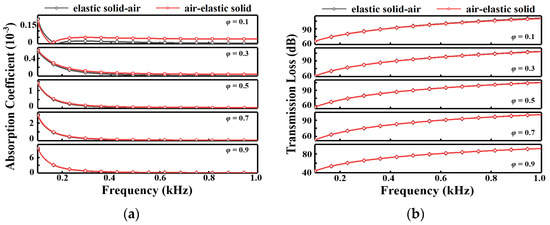Sound absorption properties of an unsaturated porous elastic plate when bonded with a solid elastic plate on top and bottom, respectively, at different porosities: (a) absorption coefficient and (b) transmission loss.