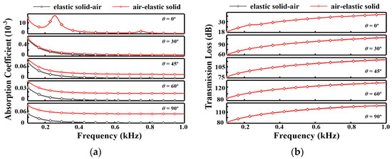 Figure 8 illustrates that there is no definitive pattern for the effect of the incidence angle of the acoustic wave on the absorption parameters (absorption coefficient and transmission loss) of unsaturated porous elastic plates when exposed to air.