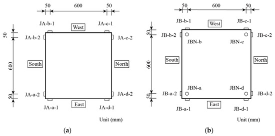 Figure 3. Layout of measuring points at column sections. (a) Section A; (b) Section B.