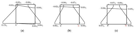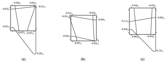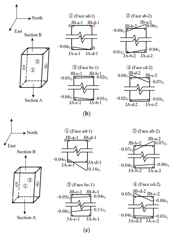 Figure 8 shows the strain distributions in Section B during the construction stage. The strains are represented in the same way as Section 4.1. As the measuring point JB-d-1 was damaged before removing the scaffold, the data of this point could not be obtained in the data collection. The strain of this point is treated as 0 and marked with red color in Figure 8b,c. It is noteworthy that the treatment of the strain at JB-d-1 as 0 is based on the observations that the strains at one corner should be close to each other and have the same sign. The possible actual strain at this point was so limited that it was reasonably treated as zero.