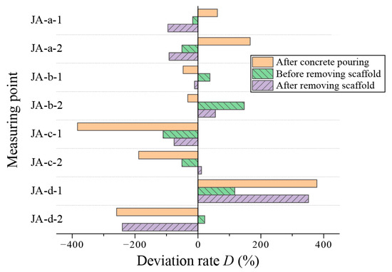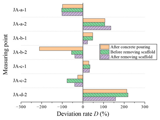 After the removal of the scaffold, the support from the scaffold on the beams next to the column disappeared. The construction load on the beams was transferred to the column in terms of eccentric compression. It led to the transformation of the tensile strains to the compressive strains and an increase in the existing compressive strains in the section, as shown in Figure 5c. Moreover, by comparing Figure 5b and Figure 5c, the change in the strains at JA-a-1, JA-b-1, JA-c-1, and JA-d-1 is observed to be more significant than that at JA-a-2, JA-b-2, JA-c-2, and JA-d-2. It is due to the fact that the moment caused by the eccentric compression mainly affected the deformations at the east and west sides of the column. The moment also turned the strain at JA-d-1 to become tensile again after the removal of the scaffold.