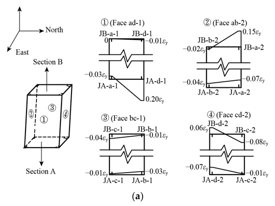 The strain distributions on the vertical steel faces between Section A and Section B of the column are shown in Figure 11. In the figure, the faces of each column are named following the same rule. For example, the face bc-1 indicates the face of the column containing the measuring points JA-b-1, JB-b-1, JA-c-1, and JB-c-1. The negative strains indicate compressive strains, and the positive strains indicate tensile strains.