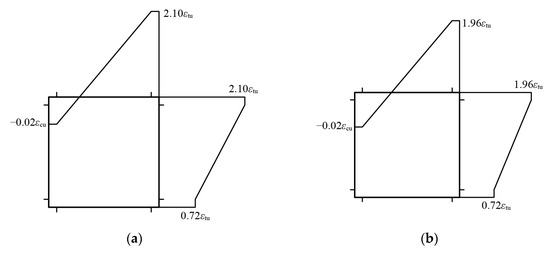 Figure 12 shows the strain distribution of the concrete in Section B during the construction stage. Note that the compressive strains are represented as multiples of the concrete ultimate compressive strain, εcu = 3300 με, and the tensile strains are represented as multiples of the concrete ultimate tensile strain, εtu = 100 με, while positive strains indicate tensile strains and negative strains indicate compressive strains. Solidification heated the concrete after pouring, and the raised temperature deviated the measurement of the embedded vibrating wire meter. Thus, the measured strains in this state are not used for analysis to avoid the impact of the incorrect strain value on the research findings.