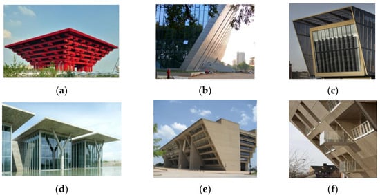 Self-shading constructions. (a) Shanghai World Expo China Pavilion (China). (b) Nanjing University of Science and Technology Gymnasium (China). (c) Eurasian tunnel operation and maintenance building (Turkey). (d) Modern Art Museum of Fort Worth (USA). (e) Dallas City Hall (USA). (f) Canada Water Library (UK).