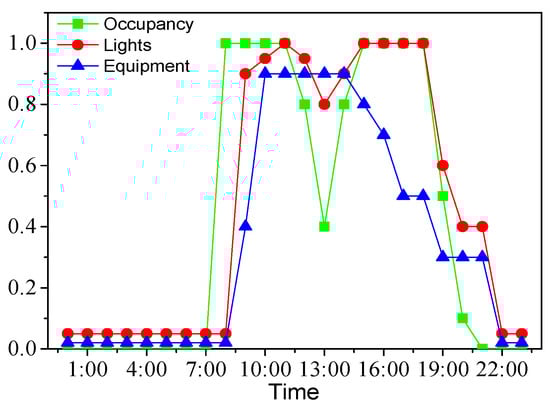 In the present study, the typical meteorological year (TMY) weather data of Guangzhou, representing many years of weather data, have been selected for the energy analysis and for calculating daylight utilization and visual comfort [32]. The source data include annual design data, typical year data and extreme years for maximum enthalpy, humidity ratio, maximum and minimum temperature and solar radiation. To facilitate modeling and calculation, in this study, the simulated building is a single floor on the ground, and the function is regarded as an office building. Figure 3 illustrates detailed schedules of the occupancy rate, lighting switch and hourly usage rate of electrical equipment. The presence of occupants was considered from 8:00 to 20:00 for each workday. The indoor air set-point temperature, based on occupancy schedules, was assumed to be equal to 20 °C during winter and 26 °C in summer. It is assumed that the artificial lighting system and HVAC system in the building will be turned off during weekends and holidays. Reporting was performed on an annual basis considering variations in both heating and cooling load and integrated data collected from the performance simulation of both the daylighting and occupants’ visual comfort.