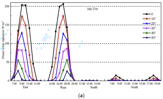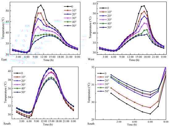 Figure 5 presents the surface temperature versus the inclination angle of the exterior wall for four directions when no air conditioning is used on 21 July. The temperature of the exterior walls was mostly above 30 °C, and there were three and four hours of extreme high temperatures above 50 °C separately for the east and west outer wall. The peak temperature of the east wall appears in the morning. There was a time shift in the occurrence of the east wall’s peak temperature. With the increase in the inclination angle of the outer wall, the time at which the peak temperature occurs is delayed, and the peak value decreases significantly. For the vertical facade, the upper temperature of the east exterior wall is 52.5 °C, and temperature drops of 3.6, 6.1, 9.8, 13.3 and 13.9 °C were observed on it along with the outward tilt angle varying from 0 to 50° with a 10-degree step. Correspondingly, the peak temperature of the west-facing wall separately decreased by 2.8, 5.3, 8.8, 12.2 and 14.5 °C from 53.9 °C. The percentages of the temperature drop reached 5.19%, 9.83%, 16.33%, 22.63% and 26.9%, respectively. The south and north external walls have a small reduction in surface temperature, i.e., a temperature drop within 3 °C. This is because the high summer solar facade angle results in less direct solar radiation on the tilted southern façade, and the northern facade is the shady side of the building, which receives little direct solar radiation. The peak temperature reduction in the tilted external wall surface functions to mitigate the harsh outside summer climat conditions as well as to manipulate the indoor air temperature to help accomplish a comfortable environment for occupants.