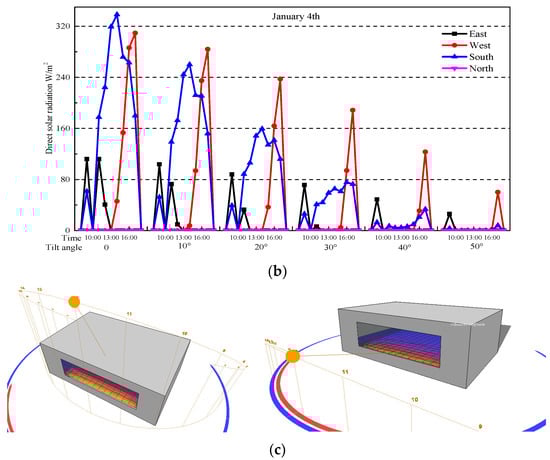 (a) Direct solar radiation during typical summer day. (b) Direct solar radiation during typical winter day. (c) Solar altitude and azimuth angles during typical summer/winter day.