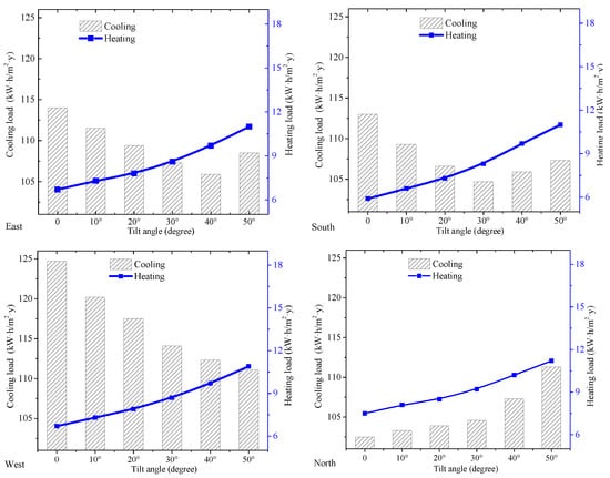 Simulations were performed on a rectangular-shaped building. In all cases, the buildings share the same properties, such as area, walls and windows, with the only variable being the tilted external facade of the building. Annual cooling loads of the building space, the most prominent in the hot region, were calculated based on the tilted external facade facing four directions. As shown in Figure 6, the inclined facades obviously reduce the east-, west- and south-facing space’s annual cooling load, though the northward space’s cooling load tends to increase. The sloped facade system acts as an integrated solar shading, as the outward tilted facade blocks the sun and thereby reduces the solar heat gains and consequently the cooling load, just like an overhang shading. The cooling load decreases as the tilt angle increases due to reduced solar energy transmission into the building during summer periods. The heating load experiences the opposite effect, having increased heating loads as the tilt angle increases. Although the increased heating load is undesirable, the total overall heating and cooling load manages to decrease as the tilt angle increases. This is due to the dominant cooling nature of architecture in a hot climate. More cool days exist than heating days; thus, the increase in the tilt angle is beneficial during the year. Indeed, the “cooling” would be more expensive than “heating” [34,35]. In areas with a hot summer and a warm winter, the building’s heating load is much less than its cooling load; thus, the heating demand can usually be ignored. It is also important to note that due to the low solar altitude in winter, the southward facade is the most important solar radiation heating surface during this time. If the southward space uses a sloping facade, the heating load increases the fastest in the south-facing space. To both block the summer solar radiation and leave access to sunshine in winter, the southward space needs much more balanced consideration. But when the northern facade adopts an inclined facade, both the cooling and heating load increase in varying degrees, so the northern facade should not be provided with an outward-tilted facade. The results of this study demonstrate that the improved thermal performance and the reduction in cooling load should be attributed to the self-shading effect of the sloped facades.