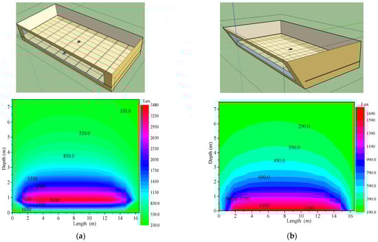 Daylighting grid and illuminance of south-facing space: (a)vertical façade; (b) thirty-degree-tilted facade.