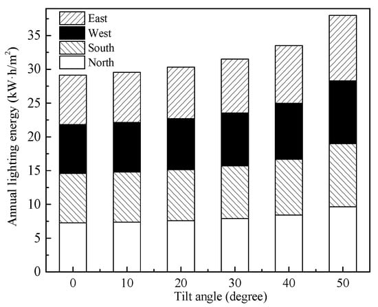 The electric light output and power input decrease continuously and linearly as the daylight illuminance increases. Figure 8 shows the annual lighting energy consumption versus the tilt angle in Guangzhou. It can be seen that the basic trend of lighting energy consumption from high to low for the four directions is: north, east, west and south. When the lights are automatically dimmed for vertical facades in the four directions, the annual lighting energy consumption in the east-, west-, south- and north-facing zone is 7.29, 7.28, 7.28 and 7.28 kWh/m 2, respectively. Even if the outer facades adopt a larger tilt angle of 50°, the annual lighting energy consumption is separately just 9.66, 9.35, 9.3 and 9.7 kWh/m2. An increase in the angle of the tilted facades angle shows a rise in the lighting energy need within an average percentage of 30%. However, compared to the case in which there is no automatic light-dimming control, where the annual lighting energy consumption can be 20.9 kWh/m2, there is not much increase in energy consumption with the use of tilted facades. Therefore, with the enhancement of natural light, automatic dimming control is more important than the vertical facade to save the energy consumption of lighting. When increasing the fenestration tilt angle, daylight availability and thermal energy loads are both decreased for all orientations, which means the electric lighting energy increases, and cooling energy demand decreases. Due to the selected city being located at a low latitude with great daylight availability and fully dimmable lighting, glare reduction can be realized with only little decreased daylight availability. Meanwhile, lighting energy consumption is insignificantly affected. Lighting energy is saved by dimming the lights or switching the electric system on/off. Clearly, the utilization of daylight reduces the need for artificial light and should thus form an important part of an adaptive facade’s control strategy to reduce a building’s energy consumption. However, the introduction of natural light is not a guarantee of visual comfort. Physiologically, daylight can cause visual discomfort when distributed unevenly in a room, resulting in patterns of high contrast.