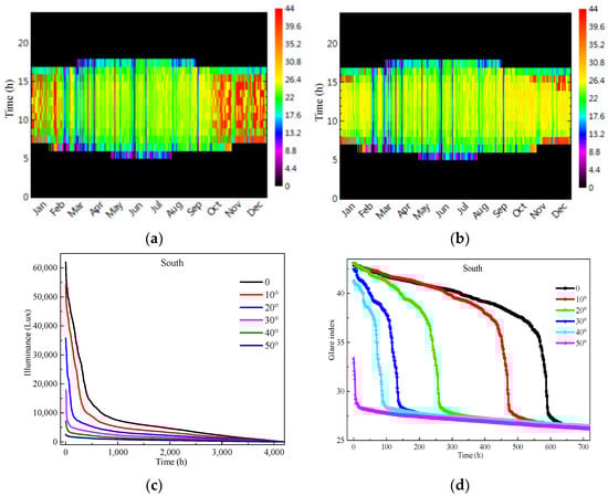(a) Discomfort glare of vertical facade. (b) Discomfort glare of thirty-degree-tilted façade. (c) Southern space illumination versus tilt angle. (d) Southern space discomfort glare hours versus tilt angle.