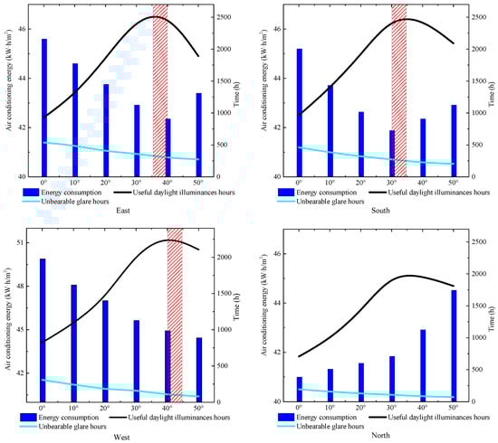 The final facade’s configuration was achieved by considering the balance between the space’s energy consumption and daylight level, as illustrated in Figure 10. With the increase in the inclination angle of the facade, the air conditioning energy demand decreased first and then increased, and the number of hours of discomfort glare continued to decrease. The hours of effective daylight illumination of 500–2000 lx first increased and then decreased. Therefore, there exists an intersection area for energy consumption and daylighting environmental indicators, and the appropriate inclination angle is located in the intersection area. First, the lighting point glare index larger than 30 h showed a continuous downward trend. There is a valley inflection point for the air conditioning energy demand of the unit area and a peak inflection point for effective daylight illuminance of the lighting point. Therefore, from the perspective of balanced energy and daylighting performance, the optimum tilt angle of the sloped facade is between the two inflection points. The area obtained from the above two inflection points to the abscissa, respectively, is the critical region of the optimum inclination angle. The east and west orientation with sloped facades with large angles could not only reduce both the external wall surface temperature and direct solar radiation in summer but also basically do not affect sunlight entering the space in winter. The south face needs to balance a reduction in the summer air conditioning load and access to winter solar warming. Tilt angles between 35° and 40° are preferred for the east facade. Smaller tilt angles of between 30° and 35° are recommended for the south facade. Larger tilt angles of between 40° and 45° are preferred for the west facade. However, an inclined facade is not recommended for the north outward facade. The annual air conditioning energy demand of the east-, south- and west-facing space is found to decrease separately by 7.1%, 7.3% and 9.9%, benefiting from the sloped facades. An effective fenestration system to balance daylight and energy demand can dramatically affect electrical lighting usage, energy use intensity and peak load of the HVAC system as well as the comfort of daylight occupants of the building space. The annual simulation results show that a tilted facade has the potential to improve the overall energy performance, and it allows for a view, for adequate daylight and for reduced air conditioning energy demand in a hot climate zone. Thermal comfort can also be improved without increasing the energy demand or decreasing visual comfort.